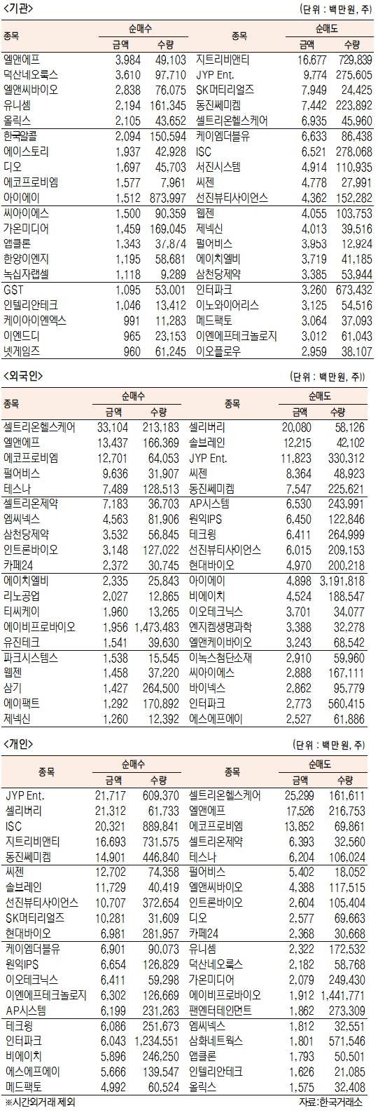 [표]코스닥 기관·외국인·개인 순매수·도 상위종목( 1월 27일)