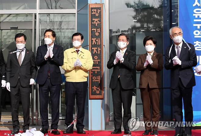(광주=연합뉴스) 조남수 기자 = 27일 오후 광주 북구 월출동 이노비즈센터에서 열린 광주경제자유구역청 개청식에서 성윤모 산업통상자원부 장관(오른쪽 세 번째)과 이용섭 광주광역시장 등 내외빈이 현판 제막식을 하고 있다. 2021.1.27