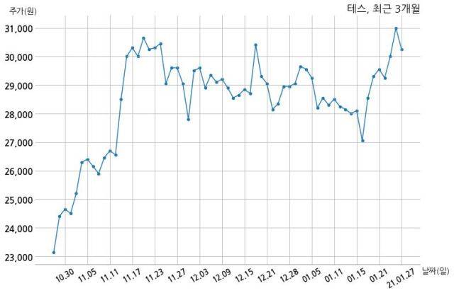 한편, 테스는 장 마감 이후 해당 기업공시를 발표했으며 오늘 종가가 30,250원, 거래량은 506,508주로, 직전 거래일 대비 750원(-2.42%) 하락했다.