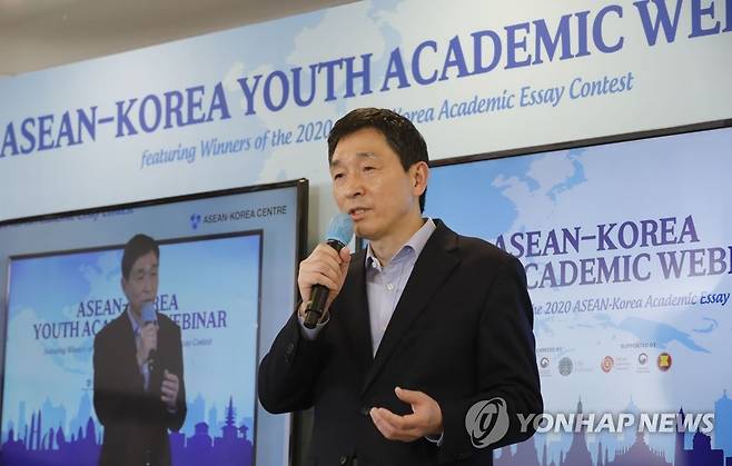 (서울=연합뉴스) 한-아세안센터가 27일 오후 유튜브 생중계로 '한-아세안 청년 학술 웨비나'를 개최했다. 사진은 이날 한-아세안 청년 학술 웨비나에서 개회사 하는 이혁 한-아세안센터 사무총장. 2021.1.27