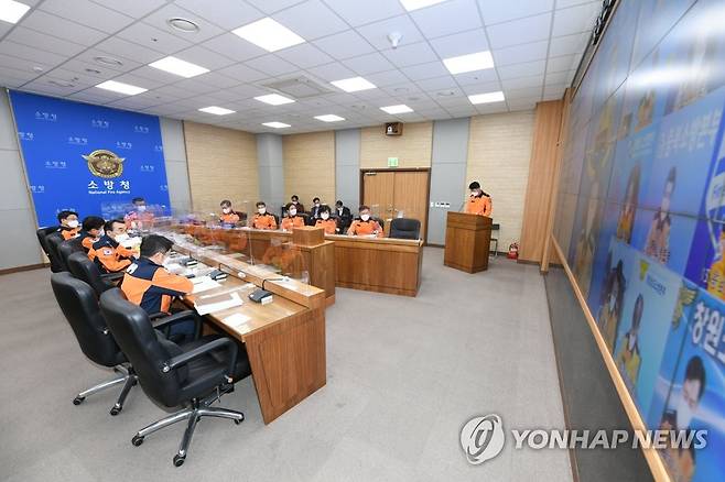 (서울=연합뉴스) 신열우 소방청장이 27일 세종시 소방청에서 4층 이하 주택화재 저감대책 추진과 관련해 전국 시·도 소방본부장과 영상회의를 진행하고 있다. 2021.1.27