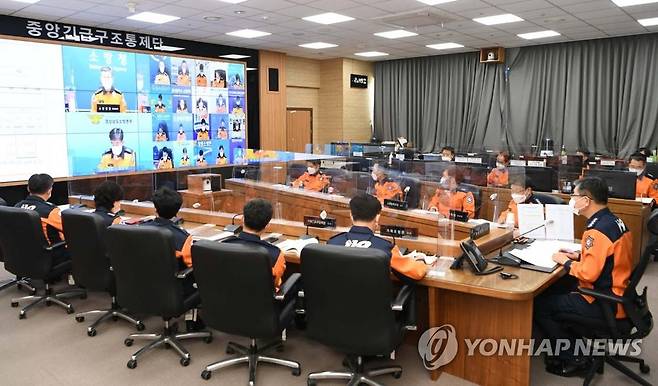 (서울=연합뉴스) 신열우 소방청장이 27일 세종시 소방청에서 4층 이하 주택화재 저감대책 추진과 관련해 전국 시·도 소방본부장과 영상회의를 진행하고 있다. 2021.1.27