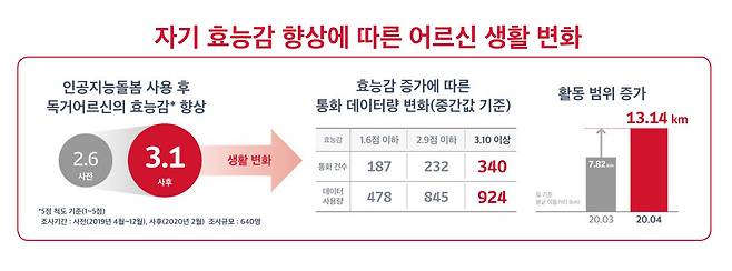 어르신 지병과 관련 통증, 낙상과 골절, 뇌출혈 등이 야간이나 새벽 시간에 많이 발생하는 특성을 보여, 인공지능 돌봄서비스가 코로나19에 따른 비대면 시대에 독거 어르신 케어 프로그램으로서 유용하게 활용되는 것으로 확인됐다.
