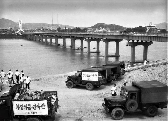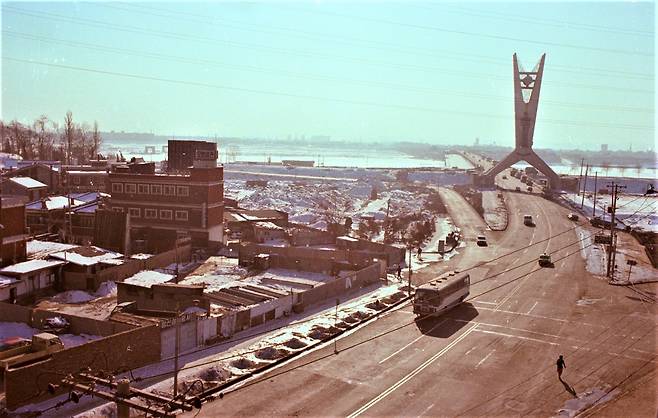 강재 보(plate Girder)를 사용한 형교 양화대교가, 한강에 우리 기술로 1965년에 최초로 만들어진다. 1982년에 그 옆에 새로 쌍둥이 다리를 놓아 길을 넓혔으니, 이 다리는 구교(舊橋)라 하겠다. 1963년에 서울 인구가 300만 명을 넘어선다. 1970년엔 500만 명을 넘어선다. 4대문 안팎이 도시빈민들의 집단 주거지가 산등성이까지 점령한다.