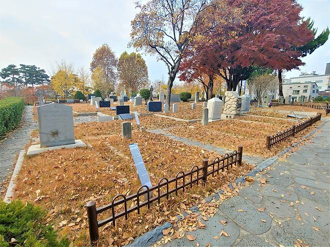 | ▲ 양화진 외국인 선교사 묘원 주로 외국인 개신교 선교사들을 중심으로 교육자, 의사, 언론인 등이 안장되어 있다. 1890년 고종이 양화진 바로 북쪽에 내어 준 땅에 조성되었다. 구 한말 조선에서 활약한 한번 쯤 이름을 들어 본 많은 외국인들의 묘비가 있다. |