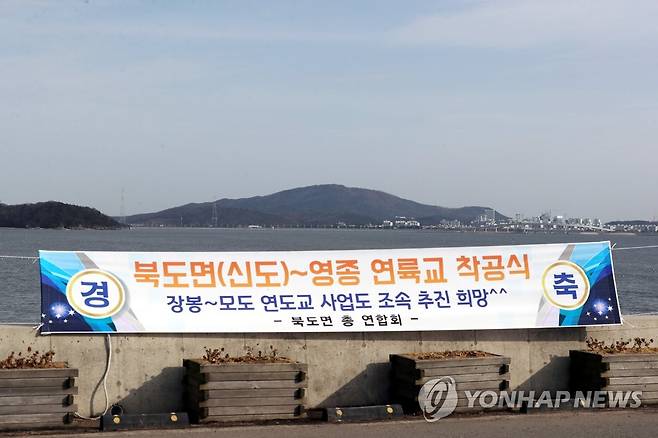 (인천=연합뉴스) 윤태현 기자 = 서해 남북 평화도로의 1단계 구간이자 영종도와 신도를 잇는 '영종∼신도 평화도로' 공사 착공일인 27일 오후 인천시 옹진군 북도면 신도 선착장에 평화도로 건설을 환영하는 현수막이 걸려 있다. 2021.1.27