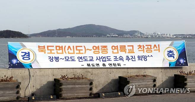 (인천=연합뉴스) 윤태현 기자 = 서해 남북 평화도로의 1단계 구간이자 영종도와 신도를 잇는 '영종∼신도 평화도로' 공사 착공일인 27일 오후 인천시 옹진군 북도면 신도 선착장에 평화도로 건설을 환영하는 현수막이 걸려 있다. 2021.1.27