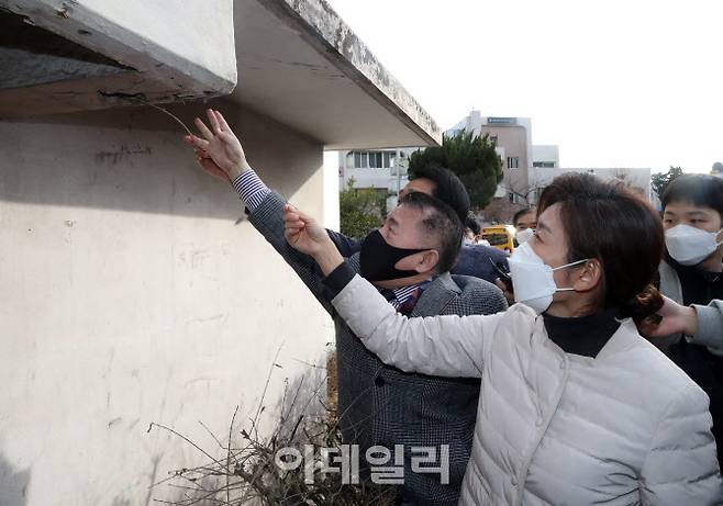 [포토]갈라진 아파트 외벽 살펴보는 나경원