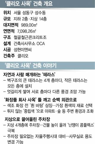서울 성동구에 자리잡은 ‘클리오’ 사옥은 멀리서 보면 마치 도심 속 거대한 조각 같다. 서울숲, 성수대교, 뚝섬역에서 바라보는 서울 풍경 속에서 고개를 삐죽 내밀고 있는 흰색 건물의 존재감은 상당하다. 흰색 세라믹 타일과 유리, 최소한의 재료로 쌓아올린 높지도 낮지도 않은 건물이지만 역동적인 외관 탓일까. 건물의 인상은 화려하기만 하다. '단순하지만 화려하다'는 역설적인 표현이 딱 들어맞는 셈이다. 한국건축문화대상 우수상과 서울시건축상 대상 등 각종 건축상을 휩쓸고 있는 이 작품의 매력은 무엇일까.