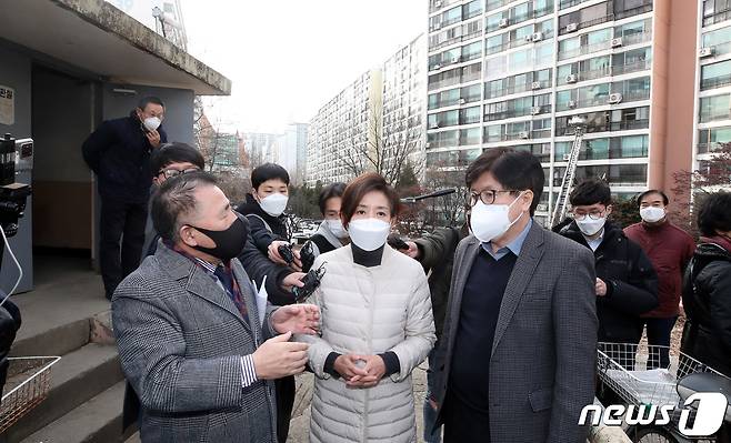 (서울=뉴스1) 국회사진취재단 = 서울시장 보궐선거에 출마한 나경원 전 국민의힘 의원이 27일 오후 서울 강남구 은마아파트를 찾아 이정돈 은마아파트 주택재건축정비사업조합설립추진위원회 위원장으로부터 설명을 듣고 있다. 2021.1.27/뉴스1