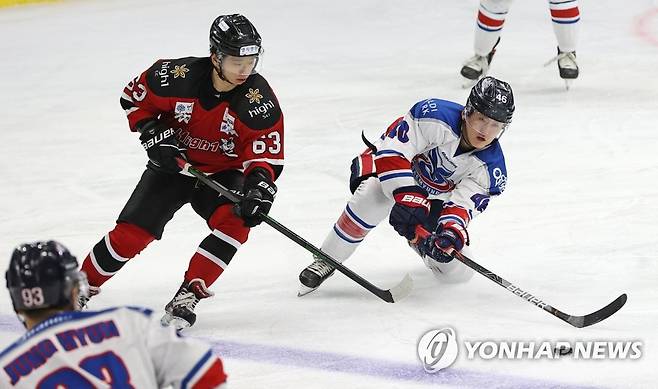 (서울=연합뉴스) 류영석 기자 = 27일 오후 서울 목동아이스링크에서 열린 제75회 전국 종합아이스하키선수권대회 대명 킬러웨일즈와 하이원의 경기.