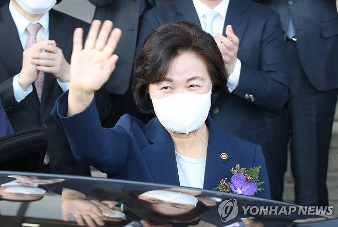 (과천=연합뉴스) 박동주 기자 = 추미애 법무부 장관이 27일 오후 경기 정부과천청사에서 열린 법무부 장관 이임식을 마치고 손을 흔들며 차량에 탑승하고 있다. 2021.1.27