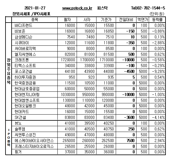 뷰노(4만250원), 씨앤투스성진(4만8000원), 핑거(3만6000원), 현대삼호중공업(5만5000원), 현대카드(1만5500원), 비씨켐(3만9000원), 메디오젠(2만4000원), 에스바이오메딕스(9500원), 아크로스(8만3000원) 등 장외종목은 주가변동없이 장을 마감했다.