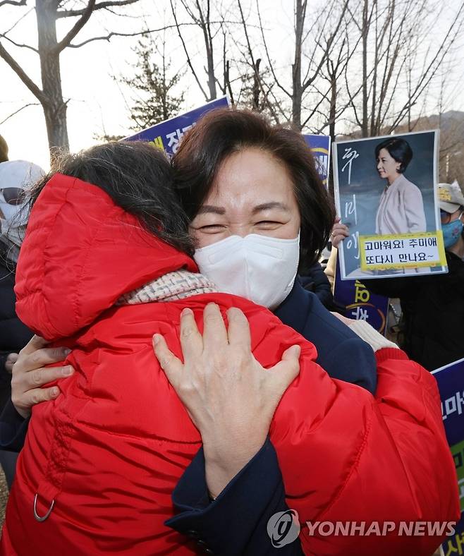 (과천=연합뉴스) 서명곤 기자 = 추미애 법무부 장관이 27일 오후 경기 정부과천청사에서 열린 법무부 장관 이임식을 마치고 청사를 떠나며 지지자들과 인사하고 있다. 2021.1.27