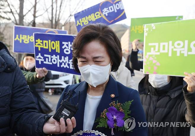 (과천=연합뉴스) 서명곤 기자 = 추미애 법무부 장관이 27일 오후 경기 정부과천청사에서 이임식을 마치고 청사를 떠나며 지지자들에게 인사를 하던 중 중 울먹이고 있다. 2021.1.27