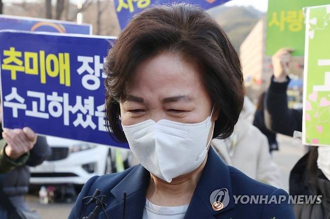 (과천=연합뉴스) 서명곤 기자 = 추미애 법무부 장관이 27일 오후 경기 정부과천청사에서 이임식을 마치고 청사를 떠나며 지지자들에게 인사를 하던 중 중 울먹이고 있다. 2021.1.27