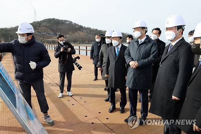 (서울=연합뉴스) 전해철 행정안전부 장관(오른쪽)이 27일 오후 인천광역시 옹진군 시·모도 노후 연도교 재설치사업 현장을 방문해 사업 추진현황을 점검하고 있다. 2021.1.27