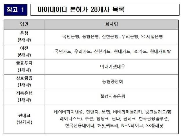 가입자가 예금, 보험, 카드, 대출, 펀드 등 본인의 금융 정보를 한데 모아 관리해주는 서비스인 마이데이터(본인신용정보관리업)에 대해 28개 회사가 최종 허가를 받는 데 성공했다. 관심을 모았던 네이버파이낸셜 등도 허가를 받는 데 성공했다.