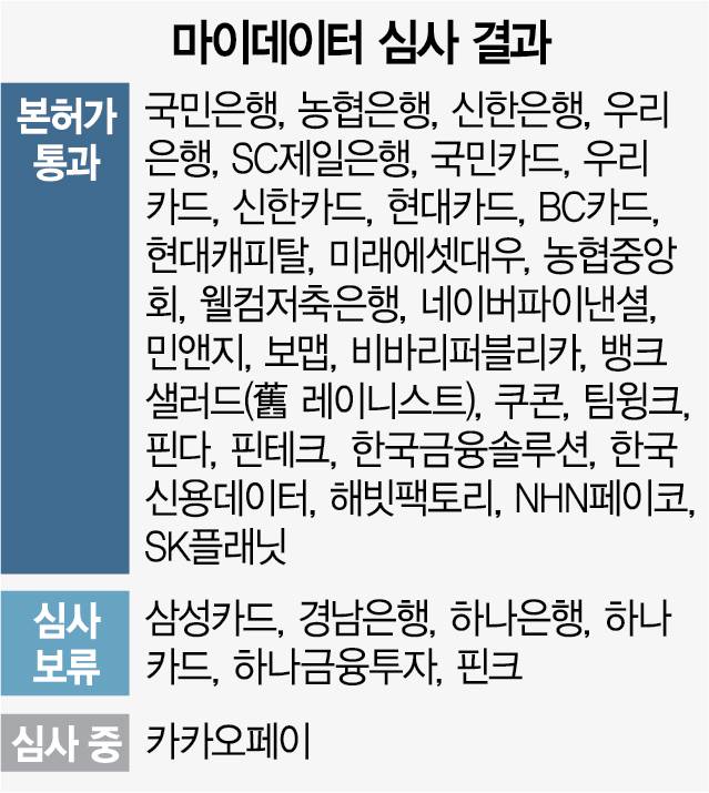 네이버파이낸셜과 국민은행을 비롯한 28개사가 금융 당국의 본인신용정보관리업(마이데이터) 허가를 받았다. 대주주 적격성 문제로 삼성카드·하나금융계열사에 이어 카카오페이는 허가를 받지 못함에 따라 서비스 중단이 불가피해졌다. 허가를 받지 못한 업체들은 심사중단제도 개선 전에 금융 당국에 대책 마련을 촉구하고 있다.