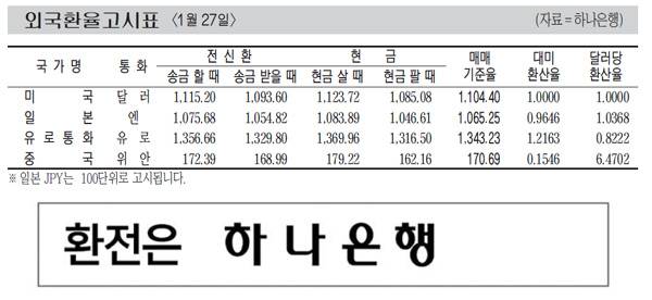 [표] 외국환율고시표 (1월 27일)