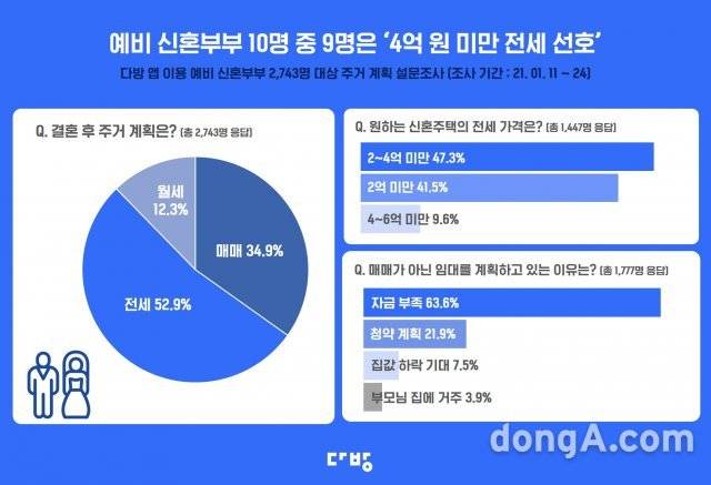 27일 다방이 예비 신혼부부 2743명을 대상으로 실시한 설문조사 결과에 따르면 전체 응답자의 절반이 넘는 52.9%(1450명)가 신혼주택으로 전세를 선호했다.