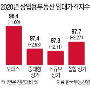 중대형 상가(3층 이상이거나 연면적 330㎡ 초과) 임대가격지수는 전년 대비 -2.63% 떨어졌다. 소규모 상가(2층 이하이고 연면적 330㎡ 이하)와 집합상가도 각각 -2.71%, -2.27% 하락했다. 부동산원은 “코로나19 영향을 직접적으로 받은 상가의 임대가격지수 하락폭이 오피스보다 크게 나타났다”고 설명했다.