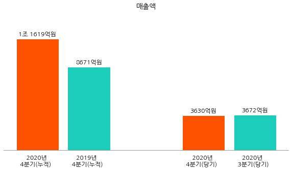 분기별 실적의 경우 2020년 4분기 매출액은 3630억원으로 동년 3분기 매출액 3672억원 대비 42억원(-1.1%) 감소했다.