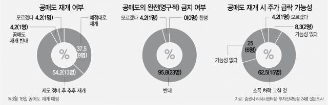 이 때문에 공매도 제도를 먼저 개선한 뒤 재개해야 한다는 의견도 많았다. 공매도 재개 시점에 관한 물음에 응답자의 절반이 넘는 13명(54.2%)이 제도 개선 후 재개해야 한다는 뜻을 밝혔고 예고한 대로 공매도를 다시 시작해야 한다는 의견은 9명으로 ‘잠시 미루자’는 의견보다 적었다.
