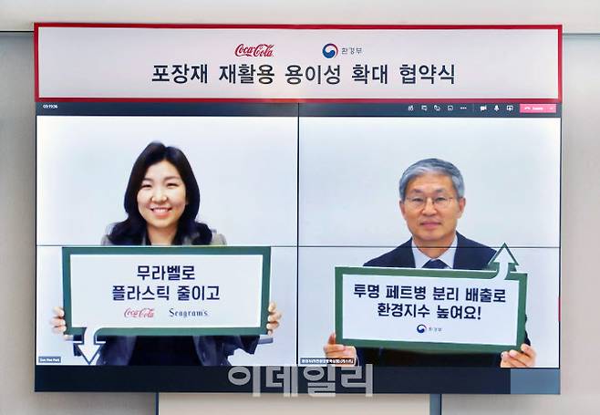[이데일리 김태형 기자] 최수정(왼쪽부터) 한국 코카-콜라 대표와 김영훈 환경부 자연환경정책실장이 27일 '포장재 재활용 용이성 확대 협약식'을 언택트 방식으로 진행하고 있다.