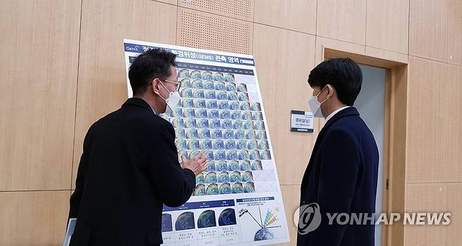(서울=연합뉴스) 안세창 수도권대기환경청장(오른쪽)이 27일 인천시 서구 국립환경과학원 소속 환경위성센터를 방문해 이동원 센터장으로부터 '정지궤도 환경위성(GEMS) 관측'에 대한 설명을 듣고 있다. 2021.1.27
