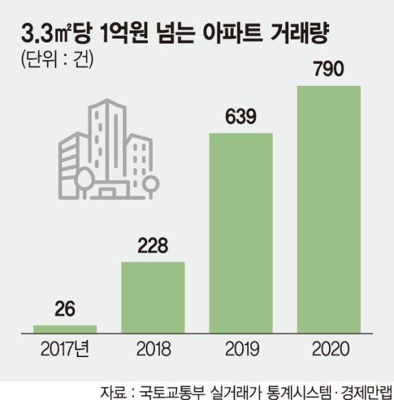27일 부동산 정보제공업체 경제만랩이 국토교통부 실거래가 통계시스템을 분석한 결과 지난해 3.3㎡당 1억원 이상에 거래된 아파트 건수는 총 790건으로 나타났다. 이는 지난 2017년 26건에 불과했던 것과 비교하면 3년새 30배나 늘어난 것이다. 3.3㎡당 1억원이 넘는 단지도 크게 늘어나고 있다. 지난해 3.3㎡당 1억원이 넘는 아파트는 68곳으로, 지난 2017년 3곳이었던 것과 비교하면 3년새 22배나 증가했다.
