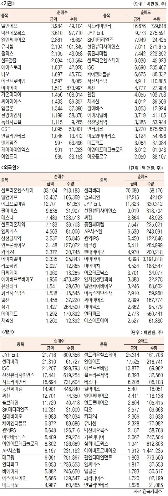 - [표]코스닥 기관·외국인·개인 순매수·도 상위종목(1월 25일-최종치)