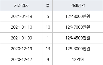 국토교통부 실거래가 공개시스템에 따르면 지난 2021년 1월 9일 서울특별시 강남구 개포동 SH공사대치1단지 1층 전용면적 39㎡형이 12억4500만원에 거래됐다. 지난 2021년 1월 19일 같은 면적형인 5층 물건이 12억8000만원에 실거래된 것과 비교해 3500만원 낮은 가격이다.
