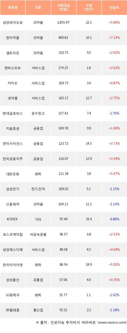 27일, 외국인 거래소에서 삼성바이오로직스(+5.86%), 한미약품(+7.14%) 등 순매수