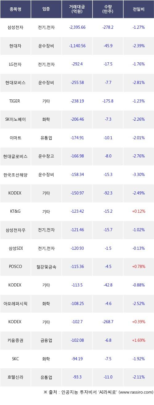 27일, 기관 거래소에서 삼성전자(-1.27%), 현대차(-2.39%) 등 순매도