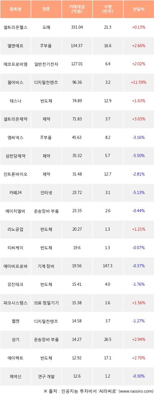 외국인 투자자의 순매수 상위 20개 종목은 셀트리온헬스케어, 엘앤에프, 에코프로비엠, 펄어비스, 테스나, 셀트리온제약, 엠씨넥스, 삼천당제약, 인트론바이오, 카페24등이다.