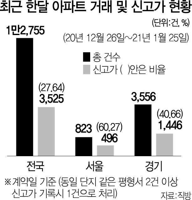 27일 서울경제가 직방에 의뢰해 분석한 결과 최근 ‘한 달간(2020년 12월 26일~2021년 1월 25일)’ 서울에서 이뤄진 아파트 거래의 60%가 직전 최고가를 넘어선 것으로 분석됐다. 이 기간 거래된 아파트는 총 823건으로 이 가운데 496건이 신고가였다. 경기도 역시 상황은 비슷하다. 한 달 새 3,556건의 아파트 거래가 이뤄졌는데 이 가운데 40.66%인 1,446건이 최고가를 기록했다. 전국적으로 보면 이 기간에 1만 2,755건의 거래가 이뤄졌고 이 가운데 신고가 비율은 27.64%로 견조한 흐름을 이어가고 있다.