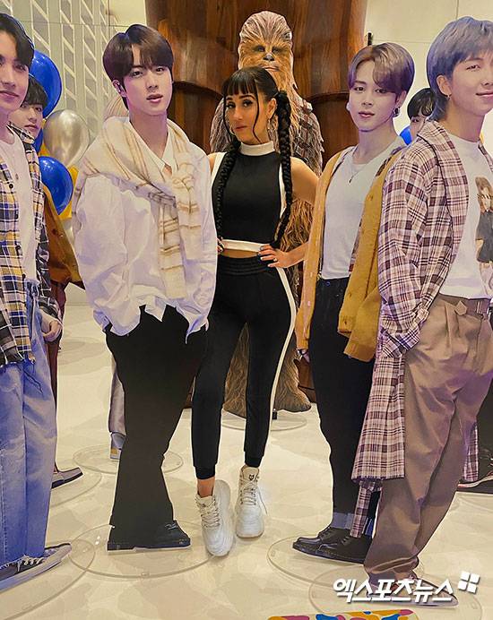 사진에서 제나 앤드류스는 방탄소년들 멤버의 입간판 사이에 서서 포즈를 취하고 있다. 스타워즈 츄바카의 입간판도 눈에 띈다.