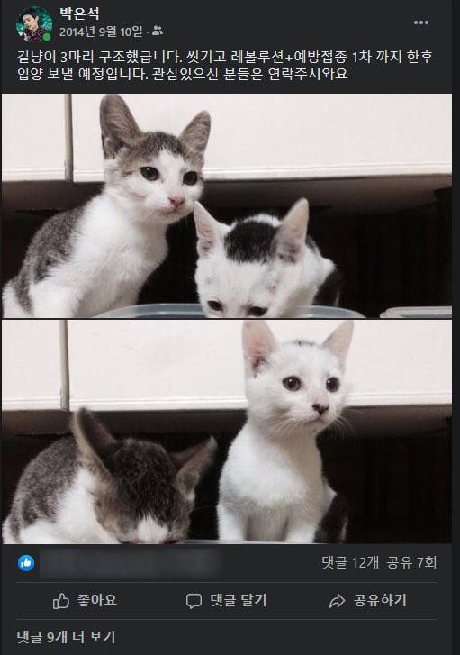 동창 B씨는 "고양이 분양 관련해서도 경험담이라고 올라오는 글을 봤는데, 이것은 뭔가 오해가 있는듯 합니다. 당시 은석이가 새끼 고양이 입양할 분을 찾고 있던 것은 사실이나 본인이 데려온 아이를 다시 누구에게 넘기려고 한 것이 아니고 어미 잃은 아기고양이 3마리를 우연히 구조하게 됐고, 그래서 키우실 수 있는 분을 찾게된 것 뿐"이라며 2014년 9월 페이스북에 게재된 당시 글을 공개하기도 했다.