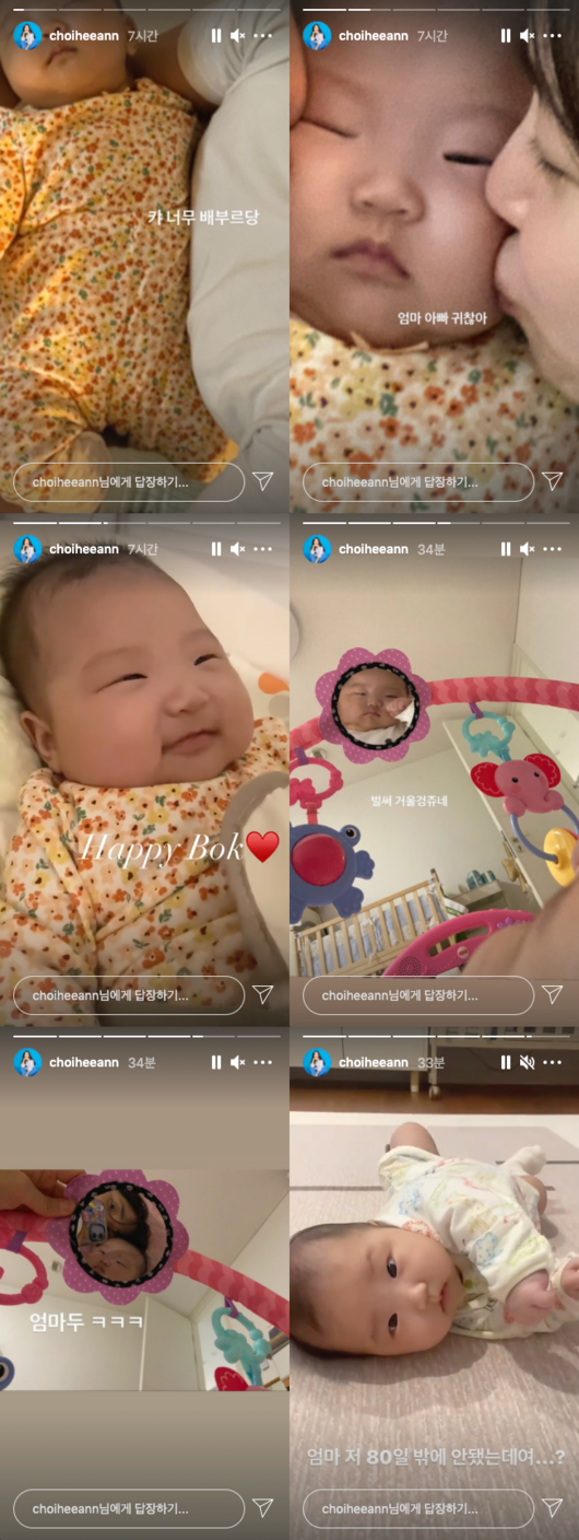 최희는 그런 딸에게 뽀뽀 세례를 퍼붓기도 하고 “엄마 아빠 귀찮아”, “벌써 거울 공주네”, “엄마도 ㅋㅋㅋ”, “엄마 저 80일 밖에 안 됐는데여” 등의 메시지를 덧붙여 보는 이들을 흐뭇하게 했다.