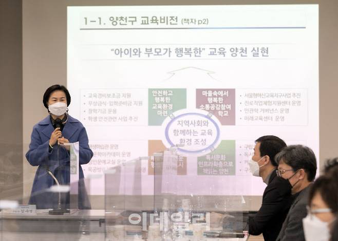 [이데일리 김태형 기자] 김수영 양천구청장이 27일 양천중앙도서관 중앙홀에서 관내 19개 중학교 교장 및 강서양천교육지원청 관계자를 대상으로 '2021년 교육경비보조사업 설명회'를 실시하고 있다.