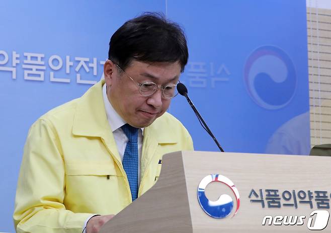 (청주=뉴스1) 장수영 기자 = 이동희 식품의약품안전평가원장이 27일 충북 청주시 오송읍 식약처 브리핑실에서 코로나19 치료제 중앙약사심의위원회 회의결과를 발표한 뒤 인사하고 있다.