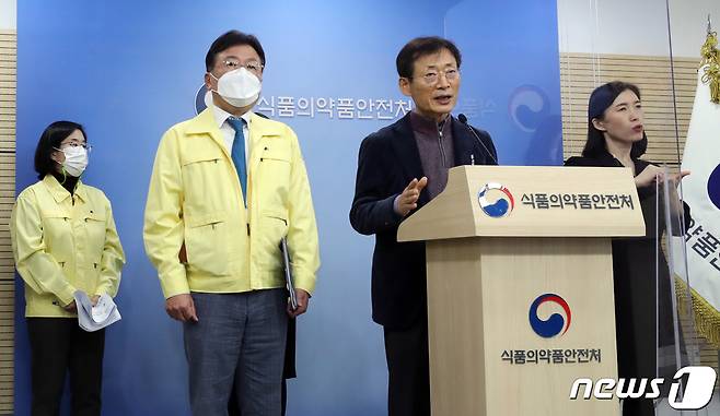 (청주=뉴스1) 장수영 기자 = 오일환 중앙약사심의위원회 위원장이 27일 충북 청주시 오송읍 식약처 브리핑실에서 코로나19 치료제 중앙약사심의위원회 회의결과를 발표하고 있다. 오 위원장 왼쪽은 이동희 식품의약품안전평가원장. 중앙약사심의위원회는 (주)셀트리온 '렉키로나주960mg(레그단비맙)'의 품목허가 신청을 위해 제출한 자료를 검토한 결과 3상 임상시험 결과를 제출하는 것을 조건으로 품목허가를 할 수 있을 것으로 자문했다고 밝혔다. 다만 경증 환자에 대한 임상적 의미는 결론을 내기 어려우며 일부 제한된 중등증 환자와 고위험군 경증 환자를 대상으로 이약을 투여할 것을 권고했다고 설명했다. 2021.1.27/뉴스1