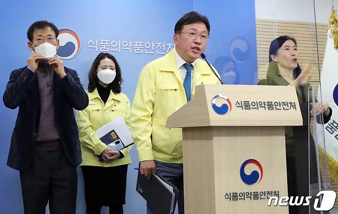 (청주=뉴스1) 장수영 기자 = 이동희 식품의약품안전평가원장이 27일 충북 청주시 오송읍 식약처 브리핑실에서 코로나19 치료제 중앙약사심의위원회 회의결과를 발표하고 있다. 왼쪽은 오일환 중앙약사심의위원회 위원장. 중앙약사심의위원회는 (주)셀트리온 '렉키로나주960mg(레그단비맙)'의 품목허가 신청을 위해 제출한 자료를 검토한 결과 3상 임상시험 결과를 제출하는 것을 조건으로 품목허가를 할 수 있을 것으로 자문했다고 밝혔다. 다만 경증 환자에 대한 임상적 의미는 결론을 내기 어려우며 일부 제한된 중등증 환자와 고위험군 경증 환자를 대상으로 이약을 투여할 것을 권고했다고 설명했다. 2021.1.27/뉴스1