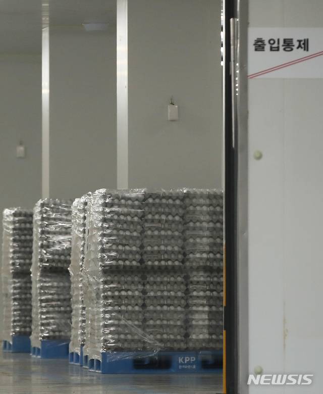 [여주=뉴시스]조수정 기자 = 27일 경기 여주시 해밀광역계란유통센터에서 AI 확산으로 부족한 계란 수급을 위해 한국농수산식품유통공사가 수입해 공매한 미국산 수입 신선란(계란)이 식품 검사를 마친 뒤 검역 창고에 적재돼 있다. 2021.01.27. chocrystal@newsis.com
