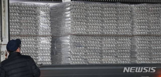 [여주=뉴시스]조수정 기자 = 27일 경기 여주시 해밀광역계란유통센터에서 한 운송업체 관계자가 AI 확산으로 부족한 계란 수급을 위해 한국농수산식품유통공사가 수입해 공매한 미국산 수입 신선란(계란)의 식품 검사를 마친 뒤 도매업체로 옮기기 위해 트럭에 싣고 있다. 2021.01.27. chocrystal@newsis.com