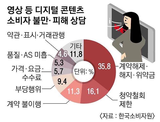국내 OTT 시장 규모가 2014년 1926억원에서 지난해 7801억원으로 연평균 26.3%씩 급속도로 성장하고 있지만, 동시에 디지털콘텐츠와 관련된 소비자 피해도 늘고 있다. 한국소비자원에 따르면 2018년부터 2020년까지 2년간 1372소비자상담센터에 접수된 디지털콘텐츠 관련 소비자 불만·피해 609건 가운데 ‘계약해제·해지·위약금’ 관련 상담이 35.8%로 가장 많았다. 이어 ‘청약철회 제한’(16.1%), ‘계약불이행’(11.3%) 순으로 이어졌다.