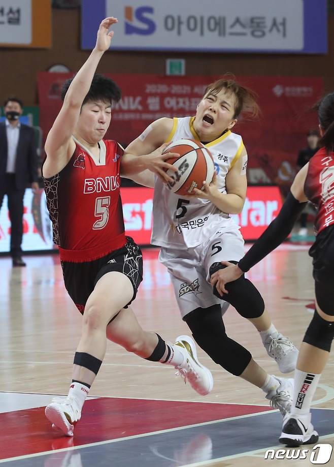 (부산=뉴스1) 여주연 기자 = 27일 오후 'KB국민은행 Liiv M 2020-2021 여자프로농구' 부산 BNK 썸과 청주 KB스타즈의 경기가 열린 부산 금정 BNK 센터에서 KB 심성영이 돌파를 시도하고 있다. 2021.1.27/뉴스1