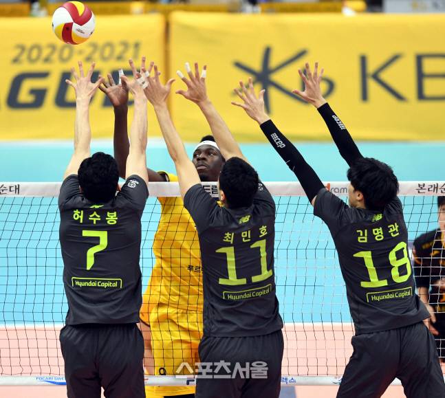 KB손해보험 케이타가 24일 의정부체육관에서 열린 2020-2021 V리그 KB손해보험과 현대캐피탈의 경기에서 상대 블로킹을 피해 밀어넣기 공격을 하고 있다.