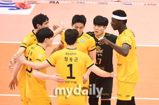 [마이데일리 = 의정부 곽경훈 기자] KB손해보험이 27일 오후 경기도 의정부체육관에서 진행된 '2020-2021 도드람 V-리그' KB손해보험-우리카드의 경기에서 환호하고 있다.- ⓒ마이데일리(www.mydaily.co.kr). 무단전재&재배포 금지 -